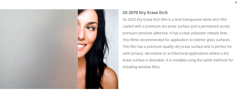 Your next option when it comes to dry erase film is frosted dry erase film. But, it doesn’t stop there! There is the standard frosted dry erase option, but then there are also different opacity options like Mist, Fog, Haze, and Etch. Each of these dry erase films has a different opacity, which affects how easily you can see through them. Just like with clear dry erase film, with frosted dry erase film, you can write directly on it. All of the frosted dry erase film options are glass applications.