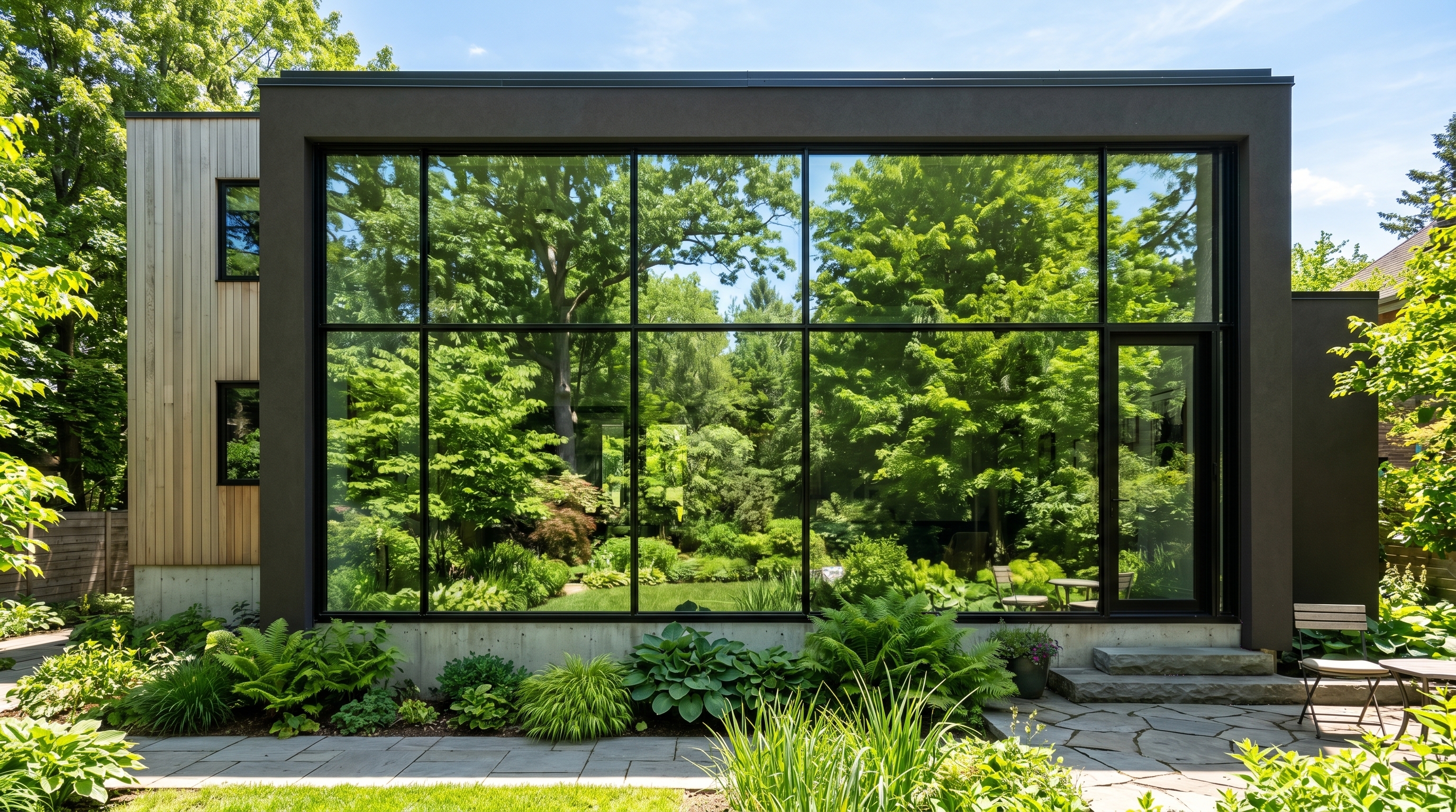 Pedestrians passing by will only see a reflection of themselves and the surrounding trees. They cannot see through the brilliant daytime privacy glass to view your living space.