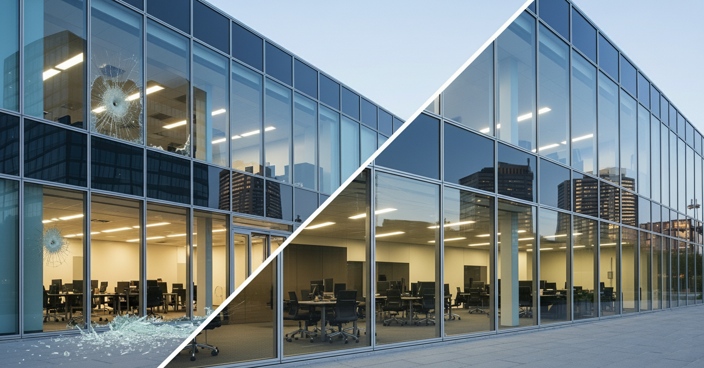 Safety and security window film has become one of the most effective solutions for commercial buildings. It strengthens glass, helps prevent break-ins, and reduces injuries caused by shattered glass.